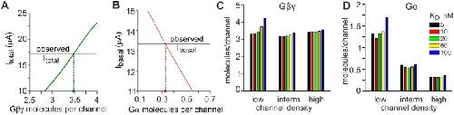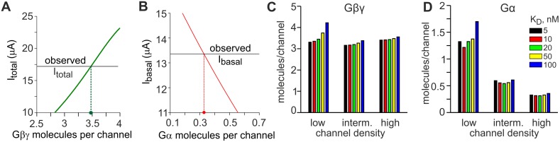 Fig 5. Estimation of Gβγ and Gα available for GIRK1/2 activation from macroscopic currents.(A, B) The method of estimation of number of Gβγ and Gα molecules per channel is exemplified for the high channel density group of Table 1. The same procedure has been applied to the low and intermediate density groups (Table 3). (A) Estimation of Gβγ available for channel activation utilizing Itotal. Simulated Itotal (green line) was calculated for a range of Gβγ surface densities using eqs 5–12, and compared with the experimentally observed Itotal. (B) Estimation of Gαi/o available for interaction with the channel. Simulated Ibasal (red line) was calculated using eqs 5–16 for a range of Gα surface densities, using the Gβγ density calculated in (A), and compared with the experimentally observed Ibasal. (C, D) The estimates of Gβγ:GIRK (C) and Gα:GIRK (D) ratios are stable in a wide range of GIRK-Gβγ interaction affinities, from KD = 5 nM to 100 nM. Simulations were done with the graded contribution model separately for the low-, intermediate- and high density groups from Table 1 (2.74, 9.7 and 21.7 channels/μm2, respectively). |