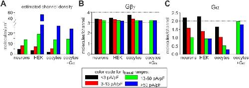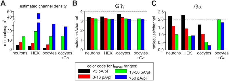 Fig 7. Estimated densities and calculated functional stoichiometries of the GIRK channel, Gβγ and Gαi/o in oocytes, HEK293 cells and neurons.Comparison of cultured mouse hippocampal neurons, and in oocytes and HEK293 cells expressing GIRK1/2. (A) Cells were subdivided into four groups according to the indicated Ibasal ranges, and channel densities were estimated assuming Iβγ = 2Itotal and Po,max = 0.105. Densities in Gα expression experiments in oocytes were estimated from Itotal in control groups of oocytes expressing GIRK1/2 and m2R only. (B, C) Estimates of Gβγ and Gα available for GIRK activation in the 4 channel density groups. In oocytes and HEK293 cells Ievoked was elicited by ACh via m2R, in neurons—by baclofen acting on GABAB receptors. |