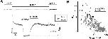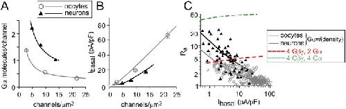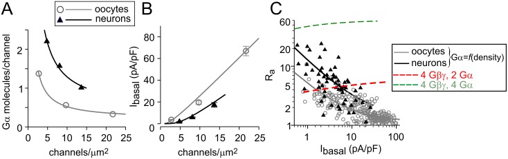 Fig 8. Inverse relation between Ibasal and Ra arises from the decrease in Gα available for GIRK activation at higher Ibasal.(A) Gα molecules/channel as a function of channel density. Data for Gα:GIRK and channel density were adopted from Tables 1 and 3 (oocytes) and Table 4 (neurons). To generate a continuous curve, the channel density-Gα relationship was arbitrary fitted with a hyperbolic decay function of the form Gα = Yo + a/x, where x is channel density and a is a constant. (B) Simulated relation between Ibasal and channel density. We utilized eqs 5–15 and solved them numerically in the 1–30 channels/μm2 range, using constant values of Gβγ:GIRK ratio (3.5 for oocytes and 3.4 for neurons) and the calculated values of Gα:GIRK from the fitted curves shown in A. (C) Simulated relationship of Ibasal and Ra, with variable Gα:GIRK (from A) and constant Gβγ:GIRK ratios. Simulations with 4 Gβγ and 2 Gα (red line) or 4 Gβγ and 4 Gα (green line) available for one GIRK1/2 channel at all densities did not adequately describe the data. |