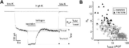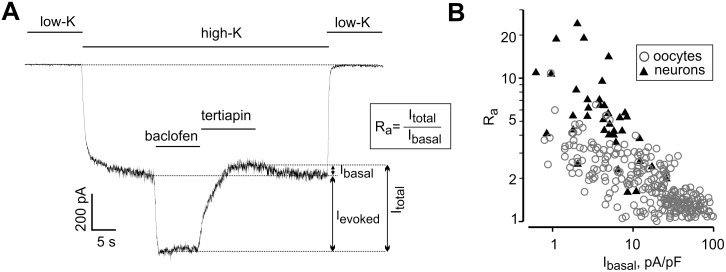 Fig 1. Basal and agonist-evoked GIRK currents in neurons and oocytes are inversely related.(A) A representative whole-recording of GIRK current in a neuron. Switching from low-K+ extracellular solution to a high-K+ solution led to the development of a large inward current probably carried by several ion channel types. Addition of baclofen elicited Ievoked. Arrows show the amplitudes of Ibasal, Ievoked and Itotal. Extent of activation, Ra, is defined as Itotal/Ibasal. (B) Inverse correlation between Ibasal and Ra in oocytes and neurons. To allow direct comparison of Ibasal in oocytes and neurons, currents in neurons were corrected for the 10 mV difference in holding potential, which was -70 mV in neurons and -80 mV in oocytes (see Methods). The correlation between Ra and Ibasal was highly significant, p = 0.000000028 (neurons; n = 60; correlation coefficient = -0.633) and p = 0.0000002 (oocytes; n = 272; correlation coefficient = -0.728) by Spearman correlation test. |