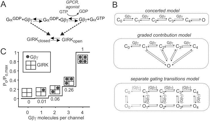 Fig 2. Gating of GIRK1/2 by Gβγ.(A) Sources of Gβγ for GIRK activation. GαGDP●Gβγ is the undissociated G protein heterotrimer. Note that, in isolated Xenopus oocytes or HEK cells, in the absence of added agonist the right, GPCR-dependent branch of the reaction of Fig 2A does not significantly contribute to Ibasal, because there are no known Gαi/o-coupled GPCRs or ambient agonists that can basally activate the GTPase cycle (discussed in [51]). (B) The schemes of “concerted”, “graded contribution” and “separate gating transitions” models of channel activation. (C) Graded contribution of the four Gβγ-occupied GIRK states to Po. Fractional Po for each state was calculated by normalizing published Po values [13] of each of the four modes (corresponding to 1–4 Gβγ occupied state) to Po,max (corresponding to 4 Gβγ occupied channel). Almost identical values have been obtained from fractional activation ratios for engineered GIRK channels having 1 to 4 Gβγ binding sites [14]. |