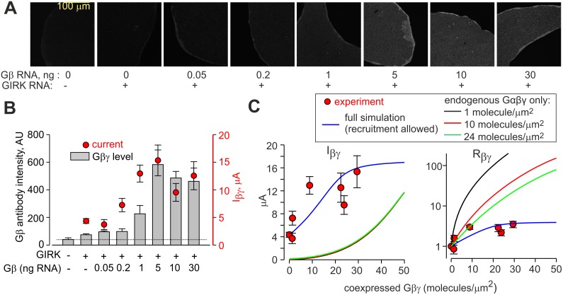 Fig 6. Dose-dependent activation of GIRK1/2 by coexpressed Gβγ: experiment and simulation.GIRK1/2 was expressed at 0.2 ng RNA. All data are mean ± SEM from one experiment. (A) Confocal images of Gβγ in giant excised plasma membranes stained with the anti-Gβ antibody. The intensity of all images was increased equally for a better viewing in this figure, but not in the process of image analysis. (B) Dose-dependence of Gβγ levels and Iβγ in oocytes injected with incrementing amounts of wt Gβγ RNA (0.05–30 ng per oocyte). Gβγ expression in the PM (grey bars) was measured from images shown in A, in 4–8 oocyte membranes, and Iβγ currents (red circles; right Y-axis) were measured in 12–16 oocytes. The dashed line shows the basal level of fluorescence, arising from the endogenous Gβγ. Note that, unlike in Western blots, in immunocytochemistry the antibody poorly recognized the endogenous Gβγ compared to the expressed bovine Gβγ. (C) Comparison of measured Iβγ and Rβγ (red circles) and simulated currents (curves). The relative Gβγ levels (from grey bars in B) have been converted into surface densities assuming that 5 ng Gβγ gives 30 molecules Gβγ/μm2. The blue line presents the simulation using graded contribution model and amounts of Gα and Gβγ (prior to coexpression of Gβγ) calculated using the methods described above: channel density was calculated from Iβγ (13.75 channels/μm2 with 5 ng Gβγ RNA in this experiment), and Gβγ and Gα were estimated from Itotal and Ibasal, giving 3.16 and 0.73 Gβγ:GIRK and Gα:GIRK ratios, respectively. For simulation with endogenous G proteins only and no Gβγ recruitment allowed (red, black and green lines), the channel density was the same and 1, 10 or 24 endogenous Gαβγ were assumed to be available for GIRK1/2. |