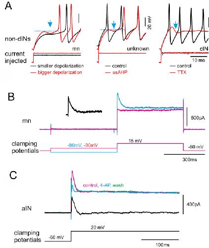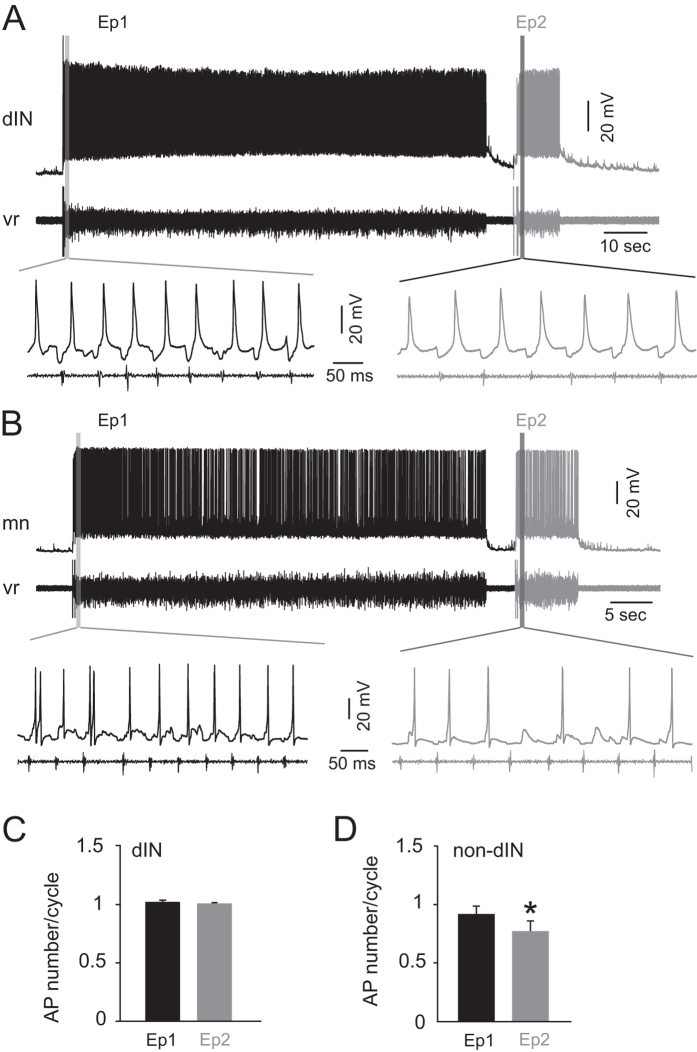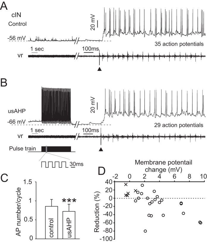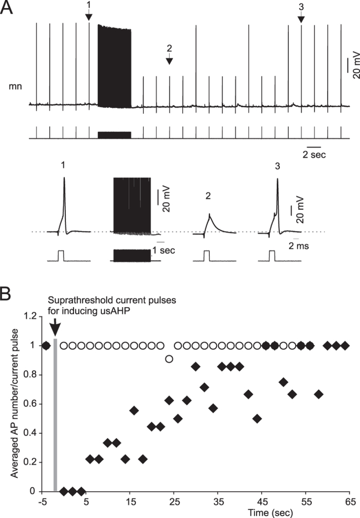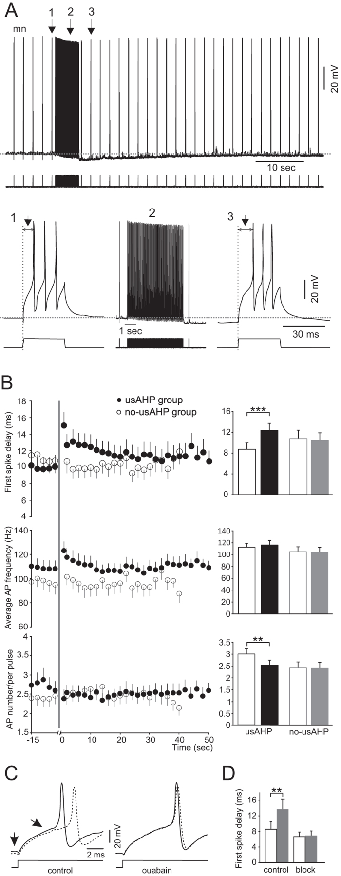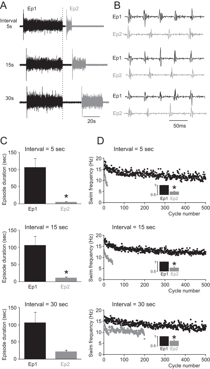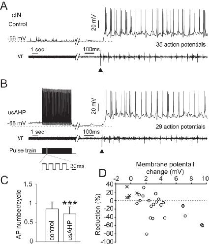 Activity-dependent modification of neural network output usually results from changes in neurotransmitter release and/or membrane conductance. In Xenopus frog tadpoles, spinal locomotor network output is adapted by an ultraslow afterhyperpolarization (usAHP) mediated by an increase in Na(+) pump current. Here we systematically explore how the interval between two swimming episodes affects the second episode, which is shorter and slower than the first episode. We find the firing reliability of spinal rhythmic neurons to be lower in the second episode, except for excitatory descending interneurons (dINs). The sodium/proton antiporter, monensin, which potentiates Na(+) pump function, induced similar effects to short inter-swim intervals. A usAHP induced by supra-threshold pulses reduced neuronal firing reliability during swimming. It also increased the threshold current for spiking and introduced a delay to the first spike in a train, without reducing subsequent firing frequency. This delay was abolished by ouabain or zero K(+) saline, which eliminate the usAHP. We present evidence for an A-type K(+) current in spinal CPG neurons which is inactivated by depolarization and de-inactivated by hyperpolarization, and accounts for the prolonged delay. We conclude that the usAHP attenuates neuronal responses to excitatory network inputs by both membrane hyperpolarization and enhanced de-inactivation of an A-current.