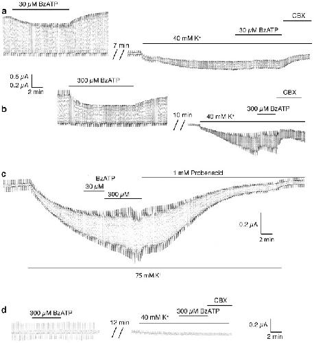 Figure 1. Extracellular K+ attenuates the inhibitory effect of BzATP on Panx1 channel currents in Xenopus oocytes.(a) BzATP (30 µM) applied to oocytes expressing Panx1 and repeatedly pulsed from a holding potential of −60 mV to +60 mV to open the channels significantly attenuated the currents. Application of 40 mM [K+]o to the same cell held at −50 mV and pulsed to −40 mV induced an inward current, indicating opening of Panx1 channels. The currents were slightly affected by 30 µM BzATP but were diminished by 100 µM carbenoxolone (CBX). (b) At 300 µM, BzATP inhibited both voltage- and K+-induced currents. (c) With 75 mM [K+] as stimulus, neither 30 nor 300 µM BzATP had a discernible inhibitory effect. (d) In uninjected control oocytes, the pulse protocol induced small currents that were not inhibited by 300 µM BzATP. As reported earlier7, increased extracellular K+ (40 mM) induced a small current of unknown origin in these cells. This K+-induced current was also not affected by BzATP (300 µM).