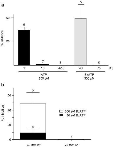 Figure 2. Quantitative analysis of inhibition of Panx1 currents by ATP or BzATP at different K+ concentrations.(a) In normal Ringer solution (1 mM K+), 500 µM ATP inhibited voltage-induced currents. With the same ATP concentration, currents induced by K+ were minimally affected (10 mM [K+]o) or not at all (42.5 mM [K+]o). BzATP (300 µM) was effectively inhibiting at 40 mM [K+]o, but not at 75 mM. (b) Competition between BzATP and K+. At 40 mM [K+]o, increasing the BzATP concentration restored the inhibitory capacity of this compound. Increasing the [K+]o to 75 mM eliminated the inhibitory effect of even 300 µM BzATP.
