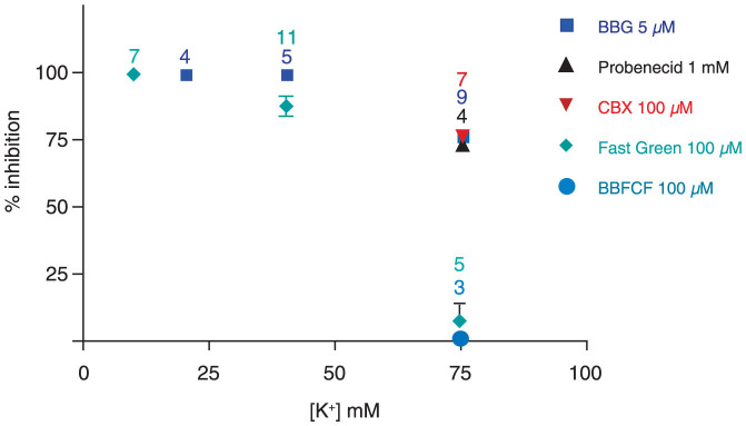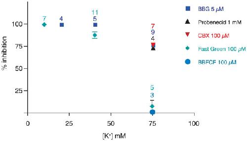 Figure 3. Inhibition of K+-induced currents by different Panx1 inhibitors as a function of [K+]o.With the exception of BB FCF and Fast green FCF, inhibition of Panx1 currents was independent of the [K+]o. Only at 75 mM [K+], a slight attenuation was observed. The inhibition by BB FCF and Fast Green FCF was attenuated at 40 mM and not detectable at 75 mM [K+].