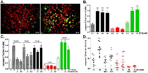 Figure 6. Panx1-dependent caspase-3 activation.(A) Representative epifluorescence image showing cleaved caspase-3 (green) in nuclei (red) of WT astrocytes exposed to ACSF containing 2.5 and 50 mM [K+]. (B) Histograms of the mean ± s.e.m values of the fraction of WT (black bars), Panx1 KO (red bars) and P2X7 KO (green) astrocytes displaying cleaved caspase-3 following exposure to 10, 25 and 50 mM K+-ACSF. ***P < 0.001 (ANOVA followed by Tukey multiple comparison test. Minimum of 4 independent experiments). (C) Bar histograms of the mean ± s.e.m. values of caspase-3 positive cells (relative to control) exposed to elevated extracellular [K+] in the absence and presence of BzATP. (D) Effect of BBG (5 μM) and BB FCF (100 μM) on caspase-3 activation induced by 50mM K+-ACSF in WT (black symbols) and Panx1 KO (red symbols). Note that in Panx1 KO astrocytes high [K+] did not lead to caspase-3 activation. ***P<0.001 (ANOVA followed by Tukey' multiple comparison test). Mean+ s.e.m. are from 9–11 fields obtained from 3–4 different cultures.