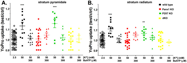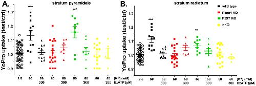 Figure 8. In situ blockade of Panx1 channels by BzATP.Means ± s.e.m. of the relative values (test/control) of YoPro fluorescence changes induced by 50 mM K+-ACSF in the absence and presence of 300 µM BzATP recorded from strata pyramidale (left) and radiatum (right) of hippocampi of wild-type (black symbols), Panx1 KO (red symbols), P2X7R KO (green symbols) and dKO (yellow symbols) mice. Data for each genotype were normalized to their corresponding values recorded at 2.5 mM K+-ACSF (open circles). ***P < 0.001, **P < 0.01 (ANOVA followed by Dunnet's test). Each symbol correspond to values obtained from a single hippocampal slice from a minimum of three mice per genotype.