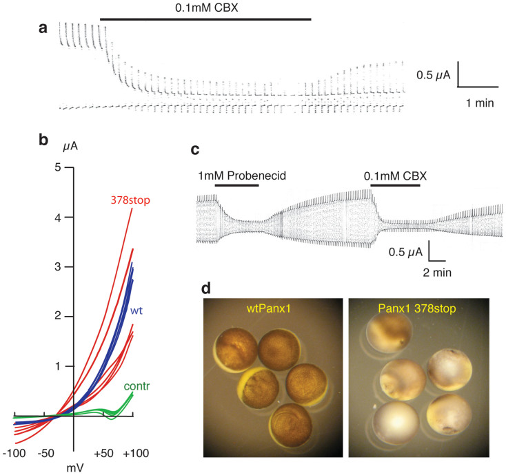 Figure 4. Pannexin truncation and cell survival.The truncation mutants Panx1 359stop and Panx1 408stop form channels similar to wtPanx1. (a) Oocytes expressing Panx1 408stop were voltage clamped, held at -50 mV and stepped to +50 mV at a rate of 0.1 Hz. The voltage steps induced large currents that were sensitive to the Panx1 inhibitor carbenoxolone (CBX). The truncation mutant Panx1 378stop forms a constitutively open channel. (b) Voltage ramps from −100 to +100 mV were applied to uninjected oocytes (green, control) and oocytes expressing wtPanx1 (blue) or Panx1 378stop (red). Recordings were taken 48 hours after mRNA injection of wt Panx1 or 9 hours after injection of Panx1 378stop. Survival of Panx1 378stop expressing cells was limited and thus did not allow for longer incubation times, hence some currents with smaller amplitude than wtPanx1. The rectification typical for wtPanx1 was absent for Panx1 378stop. Furthermore, the reversal potential was shifted to the left for the mutant. (c) The Panx1 inhibitors probenecid and carbenoxolone (CBX) reversibly inhibited currents through Panx1 378stop channels. (d) Oocytes expressing wtPanx1 were viable 48 hours after mRNA injection (left), while oocytes expressing Panx1 378stop had undergone cell death already 36 hours after mRNA injection despite of incubation in Ringer's solution supplemented with 100 µM CBX.