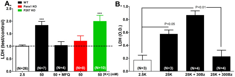 Figure 5. Panx1 mediates astrocyte cell death.(A) Means ± s.e.m. values of fold changes in LDH released from WT (black), Panx1 KO (red) and P2X7R KO (green) astrocytes exposed for 1 hr to 50 mM K+-ACSF relative to control condition (2.5 mM K+ ACSF; white bar). Note that mefloquine (MFQ) at 100 nM blocked LDH released from WT cells. (B) LDH released from astrocytes exposed for 1 hr to 25 mM K+-ACSF is enhanced by 30 µM BzATP and blocked by 300 µM BzATP. ***P < 0.001 (ANOVA followed by Tukey multiple comparison test). In parentheses are the number of samples.