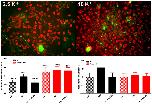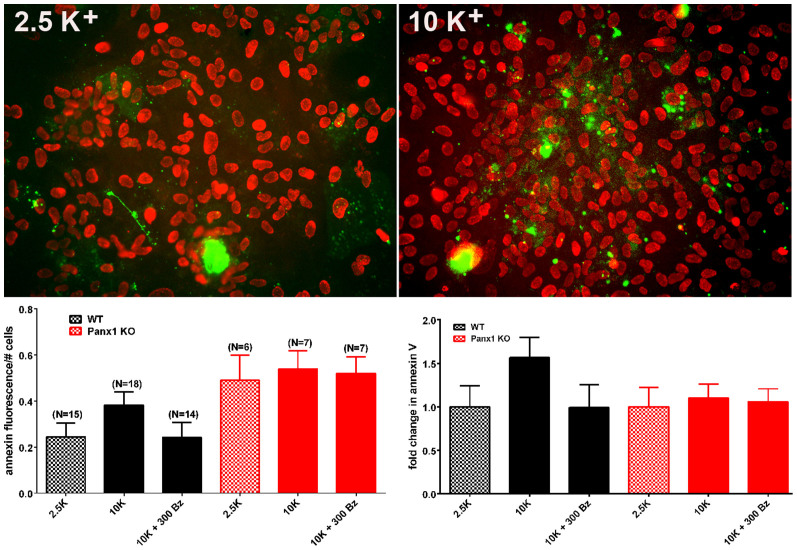 Figure 7. AnnexinV staining in astrocytes. (Top) Examples of epifluorescence images of cultured WT astrocytes treated for 1â2â hr with 2.5 and 10â mM K+- ACSF showing staining for Annexin V (green) and Dapi (red). (Bottom) Mean ± s.e.m. values of Annexin V fluorescence per total number of nuclei (left) and the mean ± s.e.m. fold changes in Annexin V (right) obtained for WT and Panx1 KO exposed to 2.5â mM K+-ACSF and to 10â mM K+-ACSF in the absence and presence of 300â µM BzATP. In parentheses are the number of images used for measurements that were obtained from 2 Panx1KO and 3 WT mice. Note that although not significant, there was a slight increase in Annexin V as measured in WT astrocytes exposed to 10â mM K+-ACSF. To avoid any bias, we measured total fluorescence and divided by cell number. This procedure results in an underestimation of K+-induced cell death because of a few dead cells in the control condition that were highly fluorescent.