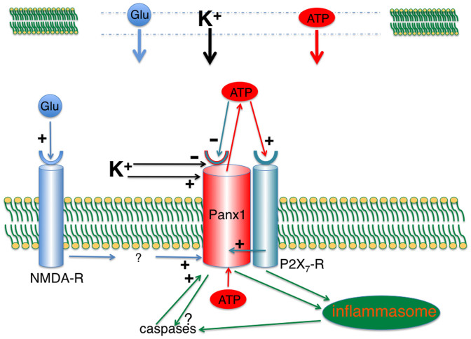 Figure 9. Early signaling events in cell undergoing secondary cell death.In the central nervous system, damaged cells (top) release ATP, glutamate and K+ into a narrow extracellular space and thus can reach concentrations approximating those in the cytoplasm. Extracellular ATP binds to purinergic receptors, including P2X7R, activating it and also activating the Panx1 channel through intracellular signaling cascade3334. ATP efflux through the Panx1 channel15 then provides a positive feedback for P2X7R activation. Under normal circumstances this positive feedback would be interrupted by the inhibition of the Panx1 channel by extracellular ATP161841. Increased [K+]o renders this negative feedback loop ineffective as shown in the present study. In addition, [K+]o stimulates Panx1 directly7. P2X7R and/or Panx1 signal to the inflammasome and thereby activate caspase-1712. In addition, caspase-3 gets activated through an unknown pathway (present study). Panx1 is a substrate of caspase-3 and its cleavage results irreversibly in constitutive channel activity27. Cell death thus is a combination of apoptotic events combined with the rundown of all membrane gradients for small molecules due to the permanently active Panx1 channel.
