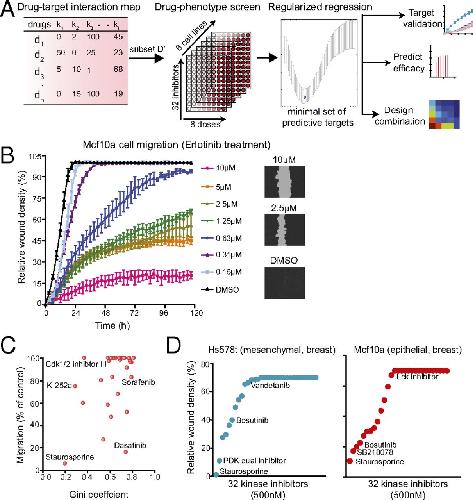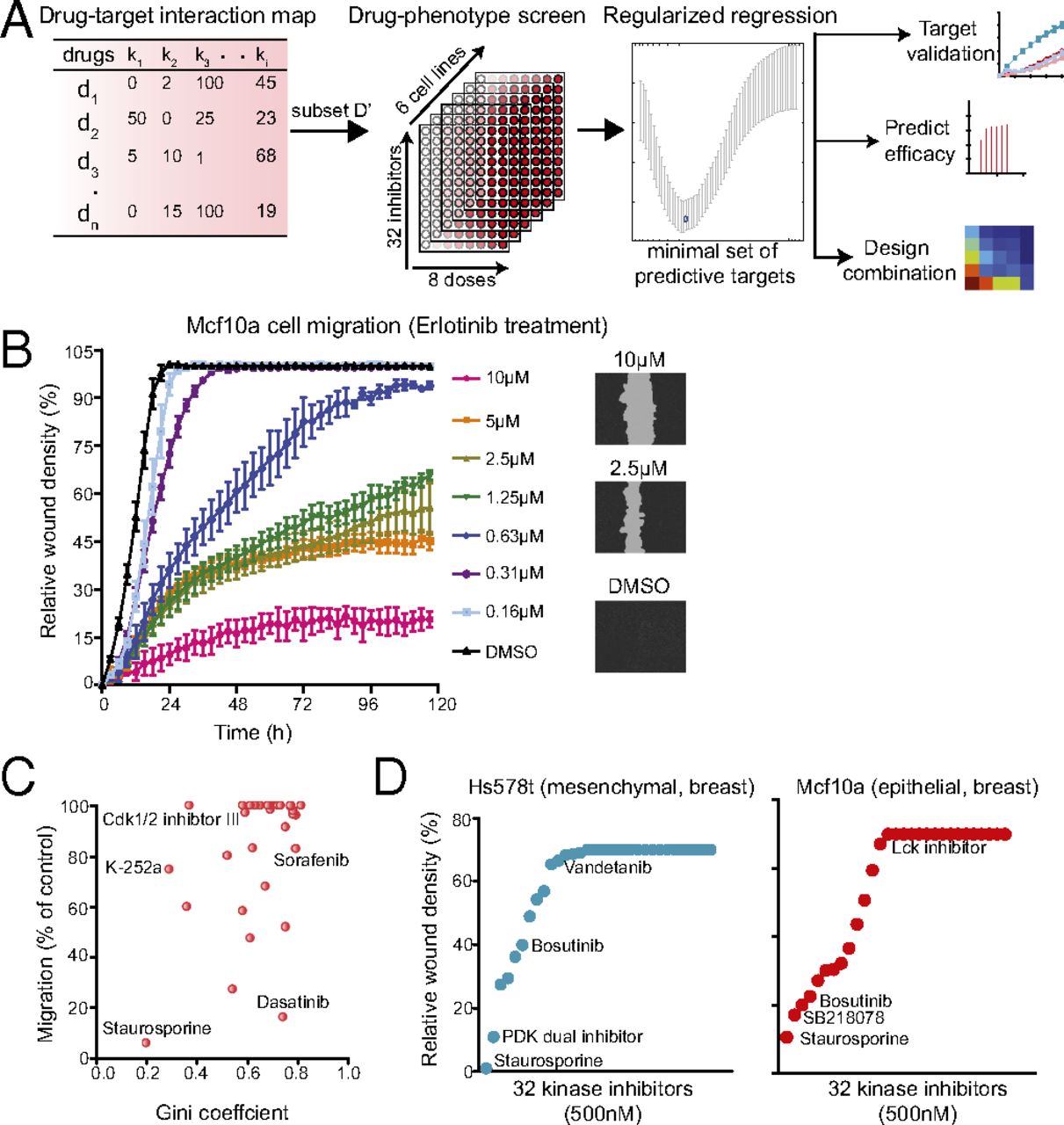 Fig. 2. An ensemble approach of exploiting polypharmacology for kinase drug target deconvolution. (A) A schematic showing our approach of using a combination of drug-target interaction map, drug phenotypic screen, and regularized regression to exploit the polypharmacology of drugs to identify drug targets, predict efficacy, and rationally design combination therapy. (B) A real-time quantitative phenotypic method to measure cell migration using the scratch wound assay. A plot of relative wound density of Mcf10a cells treated with varying doses of Erlotinib. (Right) Representative images of cells with wound area are also shown. (C) A plot of Gini score of all 32 kinase inhibitors and their effect on relative migration in FOCUS cells. (D) Plots showing the effect of 32 kinase inhibitors on cell migration in Hs578t (mesenchymal) and Mcf10a (epithelial) breast cell lines.
