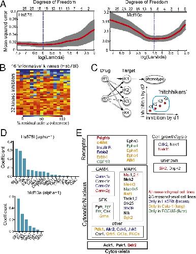 Fig. 3. Identification of informative kinases in cell migration using elastic net regularization. (A) Plots show LOOCV error using elastic net regularization fit in HS578t and Mcf10a cell lines. The error bars represent cross-validation error plus 1 SD. The kinases identified at absolute minima (blue dashed line) were termed the most informative kinases. (B) The observed kinase activities of all informative kinases identified using elastic net regularization were affected by the panel of 32 kinase inhibitors used in our screen. A heatmap showing in vitro residual kinase activities of the 16 most informative kinases identified in Hs578t cells against 32 kinase inhibitors tested. (C) An illustration showing if two inhibitors d1 and d2 are affecting four targets K1–K4 proportionally, it would be impossible to distinguish which of the affected targets is actually responsible for the phenotype. (D) Bar graphs showing the nonzero elastic net coefficients associated with the most informative kinases (determined at α = 1) identified in Hs578t and Mcf10a cells are shown. (E) Subcellular and functional annotation of informative kinases identified in all three mesenchymal cancer cells (union of 0.7 ≤ α ≤ 1.0). Kinases with known role in cell migration are listed in bold font.