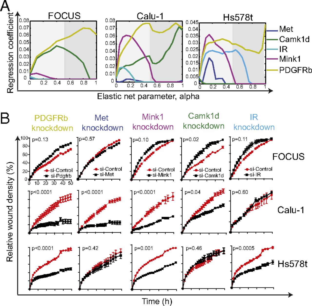 Fig. 4. Validation of cell type-specific kinases that are determinant of mesenchymal cell migration. (A) Evolution of regression coefficients. Plots showing regression coefficients for respective kinases against value of elastic-net penalty α. Nonzero regression coefficients for kinases picked at α > 0.5 (gray region) are considered significantly informative. (B) RNAi-mediated knockdown of cell type-specific kinases in mesenchymal cancer cells. Plots showing relative wound density of indicated mesenchymal cell lines transfected with either a siRNA targeting the indicated kinase or against a scrambled control. Data are the mean of at least three independent samples and error bars indicate SEM.