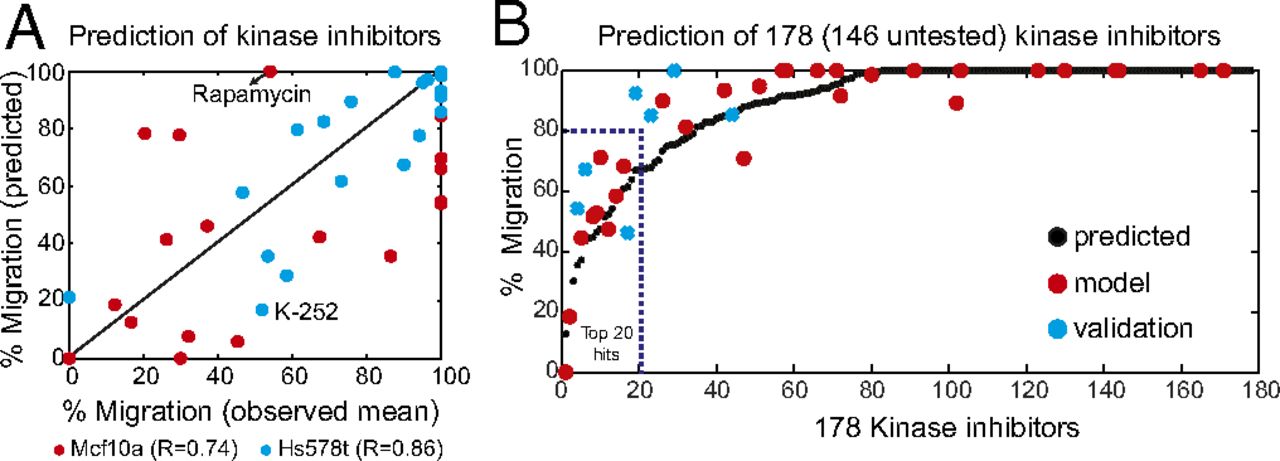 Fig. 5. Predicting the effect of kinase inhibitors on cell migration. (A) Plot showing correlation between observed and predicted migration of HS578t and Mcf10a cells treated with 32 kinase inhibitors. Unpredictable drugs (rapamycin in Hs578t and K-252 in Mcf10a) are also indicated. (B) Informative nonzero variables determined by elastic net regularization were used to predict the efficacy of 178 (146 untested) small molecule kinase inhibitors. The black circles denote predicted values of 178 kinase inhibitors, whereas red circles denote experimental validated 32 kinase inhibitor and blue crosses denote 7 previously unseen inhibitors.