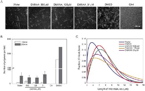Figure 4. Comparison of the effects of CA4 and DMXAA on tubulin polymerization.Polymerized tubulin was visible by fluorescence microscopy as string like shapes. Various concentrations of DMXAA and its vehicle control (water) showed similar tubulin polymerization rates. DMSO was used as a positive control. The white scale bar indicates 20 µm. All images were taken after 20 min polymerization. (B) The number of polymers per field were counted using ImageJ. Three to ten different random stage positions were counted to measure number of polymers for each condition, except for DMSO treated were one stage position was counted. Error bars were calculated as the standard deviation from the results of 3 independent experiments. (C) The Weibull-parametrized distribution of microtubule length compared across conditions in 20 min polymerization samples. The lengths were measured using ImageJ and fit to a Weibull probability density function for each condition.