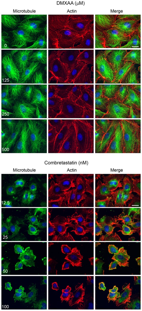 Figure 2. DMXAA did not disturb microtubule or actin structure.Cells were treated with serial dilutions of DMXAA for 30 min and CA4 for 10 min. Immuno-staining was performed using anti-DM1alpha and rhodamine-phalloidine to visualize microtubule and actin respectively. Microtubules are shown in green and actin in red. Nuclei were stained using DAPI (blue). The white bar indicated 20 µm.