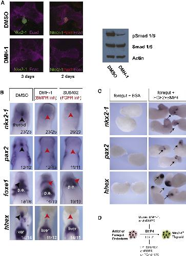 (A) BMP signaling blockade abrogates thyroid bud formation in mouse: whole foreguts from E8.0 embryos (6–8 ss) were cultured for 2–3 days in the presence of the BMP antagonist DMH-1. Co-localization of Nkx2-1+ and Pax8+ shows a discrete thyroid bud formed in control cultures (upper left). No thyroid bud was apparent when BMP signaling was inhibited (lower left). Reduced pSmad1/5 content in the presence of DMH-1 (right; western blot).