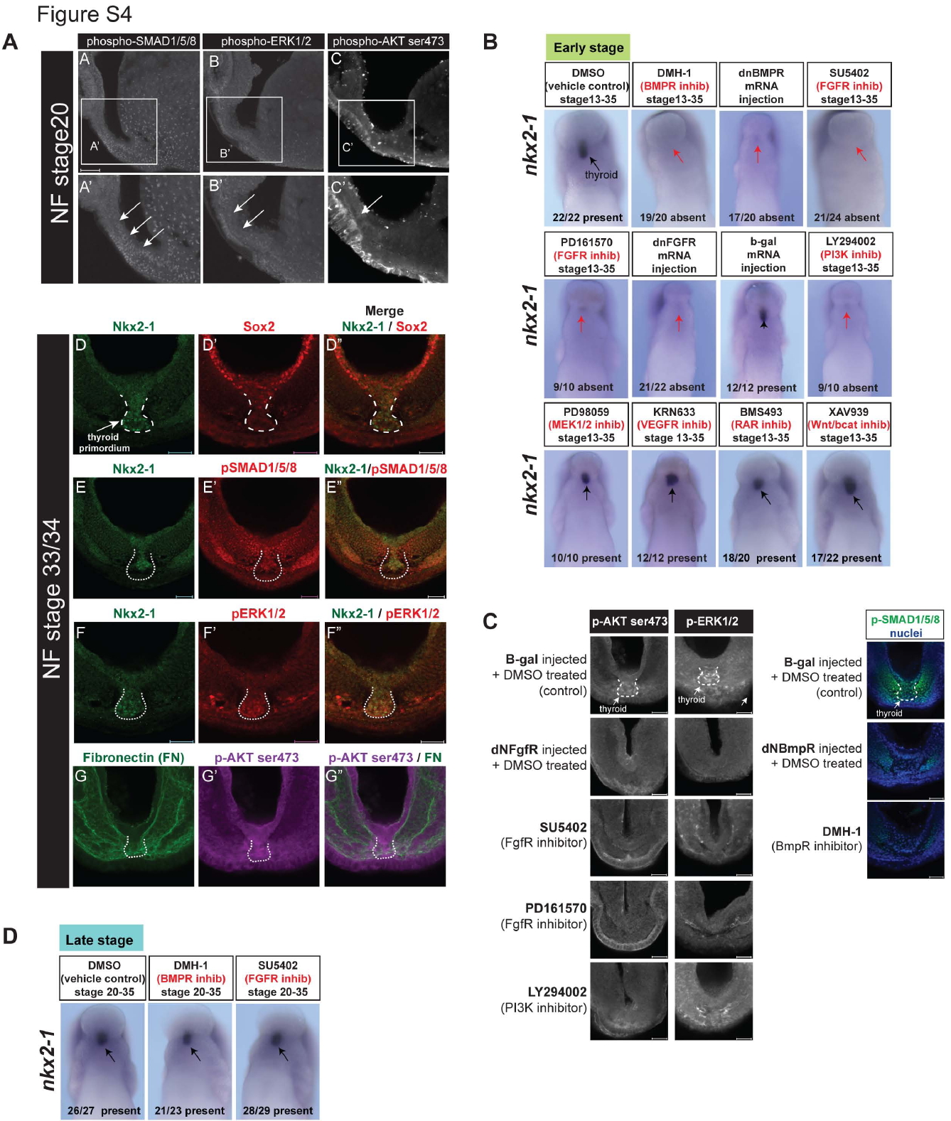 the nascent Nkx2-1+ thyroid primordium budding from the Sox2+ pharyngeal floor (D-Dâ) stains positive for phospho-SMAD1/5/8 (E-Eâ), phospho-ERK1/2 (F-Fâ), and phospho-AKT ser473. Fibronectin staining outlines the mesoderm (G-Gâ). Scale bars 50 μm. (B)
