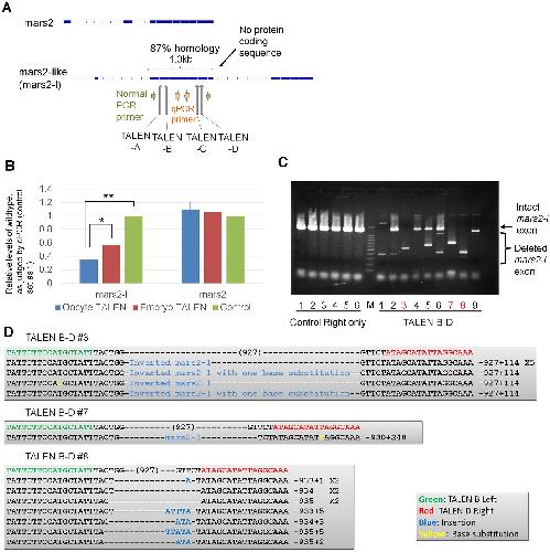(A) TALENs were designed to disrupt one of the exons of mars2-like (mars2-l) gene. PCR primers were used to confirm gene knock-out. Exons are marked by boxes. (B) The injection of TALEN mRNAs into GV oocytes (blue bar), but not into fertilized embryos (red bar), showed better knock-out of the mars2-l exon, as revealed by qPCR analyses. Control represents embryos injected only with right TALEN mRNA. N = 3â4 independent experiments. Error bars are standard errors. *P < 0.05. **P < 0.01. (C) Expression of TALENs before fertilization allowed the production of an embryo carrying only the deleted mars2-l exon in the F0 generation (lane 3, 7 and 8 in TALEN B-D, red color). Genomic DNA was extracted from single embryos at St. 10.5â11 and subjected to PCR analysis. M represents 1.5 kp and 100 bp ladder marker. (D) Large deletions of exon 2 in mars-l were confirmed by sequencing. Sample numbers correspond to those in Fig 4C. A part of inverted mars-l sequence was inserted in sample #3.