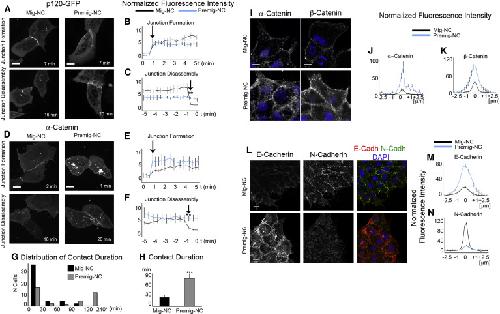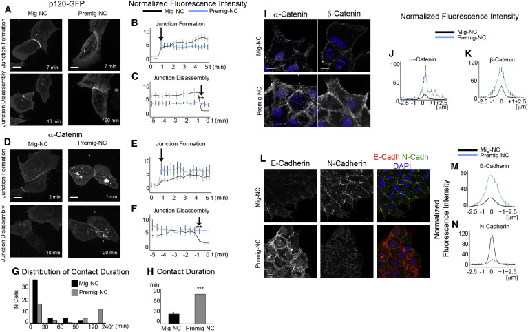 Figure 2. A Cadherin Switch Occurs during NC EMT(AâF) Assembly and disassembly of cell-cell junctions during collisions of Mig-NC or Premig-NC expressing p120-GFP (A) and α-catenin-GFP (D). Scale bars are 10 μm. Fluorescence intensity of p120-GFP (B) and α-catenin-GFP (E) at cell-cell contact are normalized to adjacent cytoplasm during first 5 min of collisions (p120-GFP: Mig-NC, n = 6, Premig-NC, n = 4; α-catenin-GFP: Mig-NC, n = 9, Premig-NC, n = 7). Normalized fluorescence intensity of p120-GFP (C) and α-catenin-GFP (F) at cell-cell contact during the last 5 min of cell-cell collisions.(G) Average contact duration for Mig-NC and Premig-NC (n = 43, Mig-NC, n = 30, Premig-NC), âââp < 0.001.(H) Distribution of contact duration for Mig-NC and Premig-NC (n = 43, Mig-NC, n = 30, Premig-NC).(I) Immunostaining for α-catenin and β-catenin in Mig-NC and Premig-NC. Scale bars are 10 μm, and nuclear staining is DAPI.(J and K) Fluorescence intensity across cell-cell junctions normalized to fluorescence in adjacent cell cytoplasm (α-catenin: Mig-NC, n = 50; Premig-NC, n = 50) (β-catenin: Mig-NC, n = 50; Premig-NC, n = 50).(L) Double immunostaining for E- and N-cadherin in Mig-NC and Premig-NC. Scale bars represent 20 μm.(M and N) Normalized fluorescence intensity diagrams (Mig-NC, n = 74, Premig-NC, n = 74). All box and whiskers charts are box and median ± 25th/75th percentile. Whiskers are min/max value, and bar charts are mean ± SEM. |