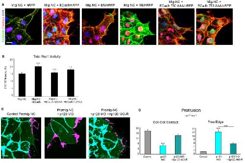 Supplemental Figure S5. Related to Figure 4. (A) Double immunostaining for E- and NCadherin in Mig-NC, Mig-NC+E-Cadh, Mig-NC+E/N, Mig-NC+N/E, Mig-NC+E-Cadh750AAA, Mig-NC+E-Cadh753AAA, scale bar 10 μm. Both antibodies are specific for the EC domain of each cadherin, therefore distinguishing the expression of the swapped CYTO domains mutants. (B) Rac1 FRET efficiency measured by acceptor photobleaching for Mig-NC, Mig- NC+E-Cadh and the p120-uncoupled mutants E-Cadh750AAA and E-Cadh753AAA (n=16 Mig-NC, n=22 Mig-NC+E-Cadh, n=15 Mig-NC+E-Cadh750AAA, n=12 Mig-NC+ECadh753AAA * P<0.05, *** P<0.001. (C) Protrusive activity of Premig-NC+ Control MO, Premig-NC+p120 MO or Premig-NC+p120 MO+Xp120 mRNA. Still time-lapse photographs of a maximal projection, Free Edge protrusions labelled in magenta, Cell-Cell contact protrusions labelled in cyan (Right), scale bar 10 μm. (D) Quantitation of Protrusion area per minute per cell obtained by subtraction analysis (n= 104 cells Premig-NC+Control MO, n=95 cells Premig-NC+p120 MO, n=103 Premig-NC+p120 MO+Xp120 mRNA*** P<0.001. Charts: mean ± s.e.m. |