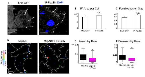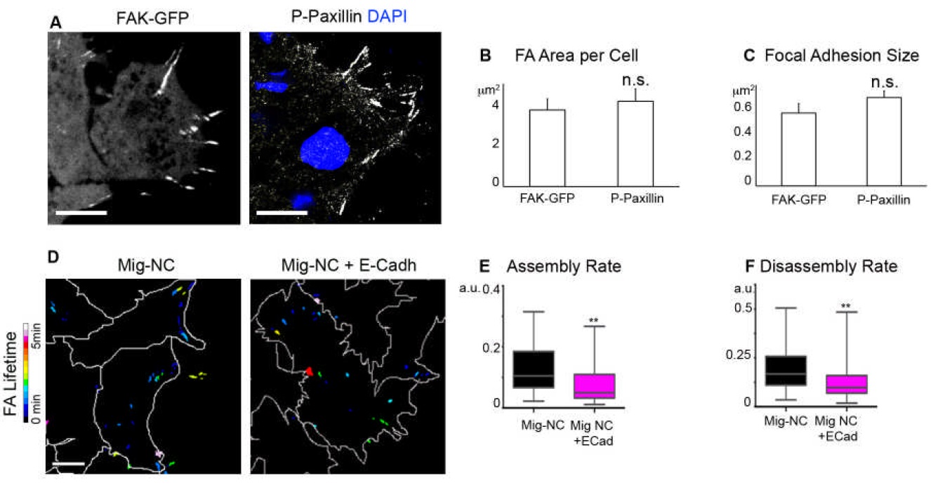 Supplemental Figure S7. Related to Figure 7. (A-C) Comparison between endogenous FA and FA observed by FAK-GFP accumulation. (A) Left: Fluorescence image of FAK-GFP, note GFP accumulation in the arears expected for FA; right: FA detected by P-Paxillin staining. No difference in the FA per cell (B) or FA size (C) was observed between P-Paxillin staining and FAK-GFP. (D) Heatmap of focal adhesion (FA) lifetime in Mig-NC and Mig- NC+E-Cadh, scale bar 10 μm. (E) Assembly Rate of FA in Mig-NC and Mig-NC+E-Cadh (Mig-NC n=58, Mig-NC+E-Cadh n=31 **P<0.01 Mann-Whitney test). (F) Disassembly Rate of FA in Mig-NC and Mig-NC+E-Cadh (Mig-NC n=57 , Mig-NC+E-Cadh n=40 **P<0.01 . All box and whiskers charts: box: median±25th/75th percentile, whiskers: min/max value, bar charts: mean±s.e.m. |