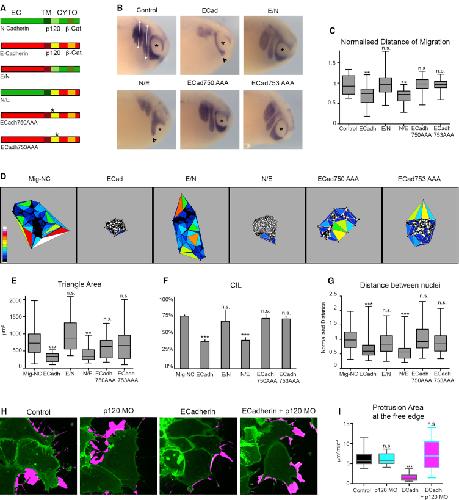Figure 4. E-cadh-p120 Interaction Is Required to Promote Cell Repolarization(A) Diagram of N- and E-cadherin domain organization: EC domain, transmembrane domain (TM), and cytoplasmic domain (CYTO). E/N mutant, E-Cadh EC/N-Cadh CYTO. N/E mutant, N-Cadh EC/E-Cadh CYTO. Point mutations (750 GGGâAAA), (753 EEDâAAA) in the juxtamembrane domain of E-Cadh are represented by the asterisk.(B) NC migration in vivo, in situ hybridization against the NC marker Twist at stage 25 X.L. embryos. Asterisks, eye; white lines, distance of NC migration. Scale bar represents 200 μm.(C) Distance of migration. Injected side normalized to uninjected side (control, n = 14, E-Cadh, n = 23, E/N, n = 20, N/E, n = 23, 750AAA, n = 10, 753AAA, n = 17), âp < 0.05, ââp < 0.01.(D and E) Dispersion Assay triangulation diagrams (D) and triangle areas (E) at 400 min (Mig-NC, n = 28, E-Cadh, n = 22, E/N, n = 24, N/E, n = 19, 750AAA, n = 31, 753AAA, n = 27), âp < 0.05, âââp < 0.01, âââp < 0.001.(F) Percentage of CIL (Mig-NC, n = 105, E-Cadh, n = 71, E/N, n = 80, N/E, n = 55, 750AAA, n = 50, 753AAA, n = 60), âââα = 0.1%.(G) Distance between nuclei 30 min after collision, âââp < 0.001.(H) Protrusive activity of Mig-NC and Mig-NC+ECadh upon p120 knockdown. Time-lapse stills of a maximal projection are shown, and free edge protrusions are labeled in magenta. Scale bar represents 10 μm.(I) Quantitation of protrusion area per minute at cluster free edge per cell by subtraction analysis (control, n = 43, p120-MO, n = 50, E-Cadh, n = 58, E-cadh+p120 MO, n = 69), âââp < 0.001. All box and whiskers charts are as follows: box and median are ± 25th/75th percentile. Whiskers are min/max value, and bar charts are mean ± SEM. |