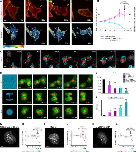 Figure 5. Repolarization Is Required to Promote Junction Disassembly(A) Time lapse stills of junction disassembly in a Mig-NC cell-cell collision. (Top) cells expressing p120-GFP and Lifeact-Cherry. Scale bar represents 5 μm. (Bottom) heatmap stills of Raichu-Rac1 FRET. Scale bar represents 7.5 μm.(B) Protrusion area and junction width over time. Junction disassembly occurs at t = 0. Cell-cell junctions were identified by p120-GFP (n = 11 cell-cell collisions), Spearman correlation coefficient r = −0.943, ∗p = 0.017.(C) Time lapse stills of cell-cell contact disassembly in colliding NC cells in vivo in Sox10:H2BmCherry/GFP-GPI zebrafish embryos. Arrows, direction of movement; arrowheads, cell-cell contact. Scale bar represents 10 μm.(D) Time lapse photographs of confined cells. Mig-NC labeled with membrane GFP and nuclearRFP (nRFP) cultured on uniform or H-shaped or disc-shaped micropatterns of fibronectin (Fn-650). Scale bar represents 10 μm.(E) Percentage of CIL (freely migrating [FM], n = 139, H, 1,600 μm2, n = 61, H, 1,100 μm2, n = 35, disc 1,600 μm2, n = 34, disc 1,100 μm2, n = 22), ∗α = 5%, ∗∗∗α = 0.1%.(F) Duration of cell-cell contact, ∗∗p < 0.01, ∗∗∗p < 0.001.(G, I, and K) Time-lapse stills of Mig-NC confined on a disc micropattern expressing N-cadherin-cherry (G), p120-GFP (I), α-catenin-GFP (K). Scale bar represents 5 μm.(H, J, and L) Fluorescence intensity over time for N-Cadherin-Cherry (H), p120-GFP (J), α-catenin-GFP (L). N-cadherin-cherry FM, n = 7, H, n = 4, disc, n = 6; p120-GFP FM, n = 7, H, n = 4, disc, n = 8; α-catenin-GFP FM, n = 9, H, n = 4, disc, n = 4, ∗∗p < 0.01. All box and whiskers charts are as follows: box and median are ± 25th/75th percentile. Whiskers are min/max value, and bar charts are mean ± SEM. |