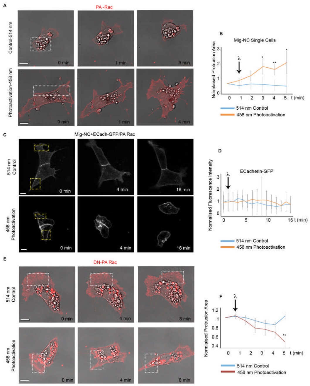 Supplemental Figure S6. Related to Figure 6. (A) Photograms from a photoactivation experiment. Mig-NC expressing PA-Rac-Cherry. Illumination of the area in the box (white dashed lines) with 514 nm control wavelength (top) does not trigger cell protrusion; illumination of the area in the box (white dashed lines) with 458 nm wavelength results in formation of a new protrusion(bottom), scale bar 10 μm. (B) Protrusion area over time. Illumination occurs at t=1 min (arrow) ( 514 nm n=5 cells, 458 nm n=6 cells, * P<0.05 **P<0.01 ). (C) Time lapse stills from a photoactivation experiment. Mig-NC expressing ECadh- GFP and PA-Rac Cherry. Illumination of the area in the box (yellow dashed lines) with 514 (top)or 458 nm (bottom) wavelength does not alter E-Cadh-GFP localization, scale bar 10 μm. (D) Normalised E-Cadh-GFP junctional intensity over time. Illumination occurs at t=1 min (arrow) (514 nm n=6 cells, 458 nm n=6 cells). (E) Photograms from a DN-Rac photoactivation experiment. Mig-NC expressing DN-PA-Rac-Cherry. Illumination of the area in the box (white dashed lines) with 514 nm control wavelength (top) does not trigger protrusion collapse; illumination of the area in the box (white dashed lines) with 458 nm wavelength results in collapse of the protrusion in the illumination area(bottom), scale bar 10 μm. (F) Protrusion area over time. Illumination occurs at t=1 min (arrow) (514 nm n=5 cells, 458 nm n=5 cells, **P<0.01).Charts: mean ±s. e.m. |