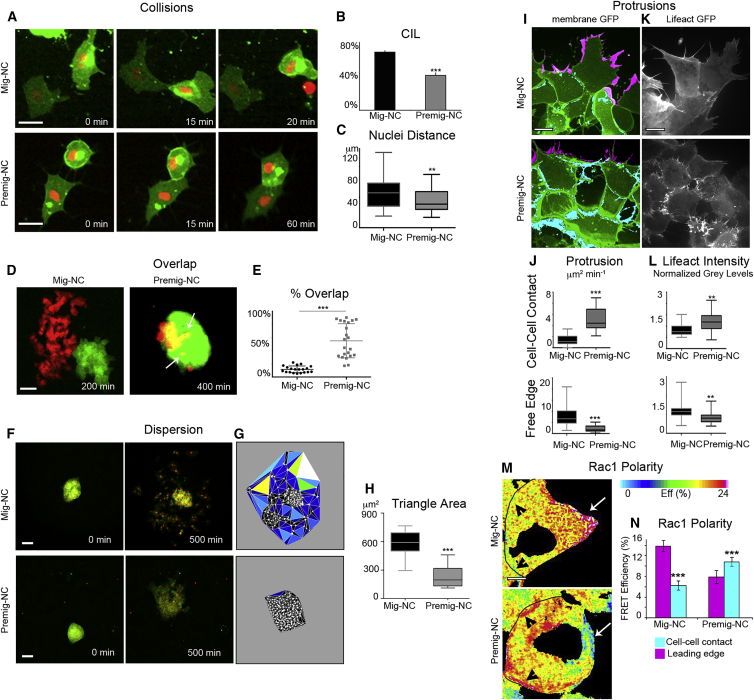 Figure 1. Migratory, but Not Premigratory, NC Exhibit CIL(A) Collisions of Mig-NC and Premig-NC. Scale bar is 20 μm. Time in minutes is indicated. Note that Mig-NC moves away from each other, while Premig-NC remains in contact.(B) Percentage of collisions displaying CIL (Mig-NC, n = 132, Premig-NC, n = 98), âââα = 0.1%.(C) Distance between nuclei 30 min after collision (Mig-NC, n = 80, Premig-NC, n = 64), ââp < 0.01.(D) CIL is analyzed by measuring the overlap between two NC explants, which is minimal for Mig-NC as they exhibit CIL. Scale bar represents 60 μm.(E) Percentage of overlap between explants (Mig-NC, n = 19, Premig-NC, n = 19), âââp < 0.001.(F) Dispersion assay for Mig-NC and Premig-NC explants. Scale bar represents 50 μm. Note that Mig-NC disperses more efficiently than Premig-NC.(G) Cell dispersion was analyzed by measuring the area between neighbor cells (nuclei) at 500 min, color coded according to size of triangles.(H) Triangle area (Mig-NC, n = 10, Premig-NC, n = 23), âââp < 0.001.(I) Protrusive activity of Mig-NC and Premig-NC. Maximal projection, free edge protrusions are labeled in magenta, and cell-cell contact protrusions are in cyan. Scale bar represents 10 μm.(J) Protrusion area per minute per cell obtained by subtraction between consecutive frames (Mig-NC, n = 45, Premig-NC, n = 80),âââp < 0.001.(K) Lifeact-GFP. Scale bar represents 10 μm.(L) Lifeact-GFP fluorescence intensity (Mig-NC, n = 12, Premig-NC, n = 15), âââp < 0.001.(M) Spatial distribution of Rac1 FRET efficiency. Cell-cell junctions are outlined in black, with the free edge pointed to with an arrow; scale bar represents 5 μm.(N) Rac1 polarity (Mig-NC, n = 24, Premig-NC, n = 24), âââp < 0.001. All box and whiskers charts are box/median ± 25th/75th percentile. Whiskers are min/max value, and bar charts are mean ± SEM. |