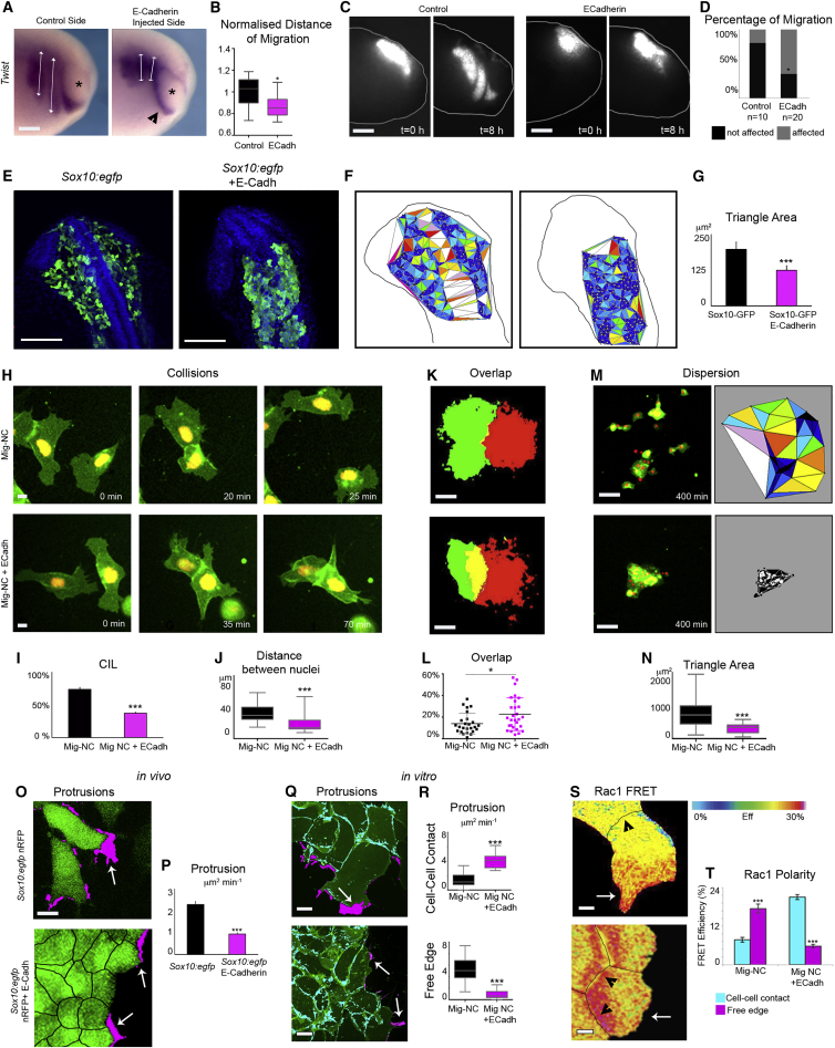 Figure 3. E-Cadherin Inhibits NC Migration In Vivo and CIL In Vitro(A) NC migration was analyzed in vivo by performing an in situ hybridization against the NC marker Twist of stage 25 Xenopus laevis embryo. Note the longer NC streams in control compared with E-cadherin expressing embryos. Asterisks are eye. Scale bar represents 200 μm.(B) Distance of migration for each stream. The injected side is normalized to the uninjected side (n = 19 embryos, âp < 0.05).(C) Fluorescently labeled WT or E-Cadh expressing NC grafted into WT embryos before (t = 0) and after (t = 8 hr) migration. Scale bars represent 250 μm. Note that inhibition of NC migration by E-cadherin is cell autonomous.(D) Percentage of migrating NC grafts (control, n = 10, E-Cadh, n = 20), âα = 5%.(E) Confocal projection of sox10:egfp zebrafish embryos injected with nuclear RFP (left) or nuclear RFP +E-Cadherin (right). Blue is DAPI. Green is GFP fluorescence. Note the dramatic inhibition in cell dispersion in E-cadherin-injected embryos. Scale bar represents 100 μm.(F) Cell dispersion was quantified by measuring the area of triangles formed by neighboring cells. Color-coded triangulation diagram for the images in (E).(G) Triangle area (sox10:egfp, n = 6, sox10:egfp +E-Cadh, n = 6), âââp < 0.001.(H) Collisions of Mig-NC or Mig-NC+ECadh cells. Scale bar represents 10 μm.(I) Percentage of CIL (Mig-NC, n = 40, Mig-NC+E-Cadh, n = 29), âââα = 0.1%.(J) Distance between nuclei, âââp < 0.001.(K) Explant overlap assay, thresholded images. Scale bar represents 60 μm.(L) Percentage of overlap between explants (Mig-NC, n = 25, Mig-NC+E-Cadh, n = 28),âp < 0.05.(M) Dispersion assay. Mig-NC and Mig-NC+ E-Cadh at 400 min (left) and color-coded triangulation diagram (right). Scale bar represents 50 μm.(N) Triangle area (Mig-NC, n = 28, Mig-NC+E-Cadh, n = 22). âââp < 0.001.(O) Time lapse stills of living sox10:egfp NC cells in vivo. Free edge protrusions in magenta. Arrows represent protrusions. Scale bar represents 10 μm.(P) Quantitation of protrusion area per minute per cell in vivo (sox10:egfp, n = 72 cells, sox10:egfp +E-Cadh, n = 168 cells), âââp < 0.001.(Q) Protrusive activity of Mig-NC and Mig-NC+E-Cadh. Maximum projection and free edge protrusions are in magenta. Cell-Cell contact protrusions are in cyan. Scale bar represents 10 μm.(R) Quantitation of Protrusion Area per minute per cell (Mig-NC n = 43, Mig-NC+E-Cadh n = 66), âââp < 0.001.(S) Rac1 FRET efficiency. Cell-cell junctions are outlined in black. Scale bar represents 5 μm.(T) Rac1 FRET efficiency at cell-cell contact and at leading edge (Mig-NC, n = 24, Mig-NC+E-cadh, n = 24), âââp < 0.001. All box and whiskers charts are as follows: box and median are ± 25th/75th percentile. Whiskers are min/max value, and bar charts are mean ± SEM. |