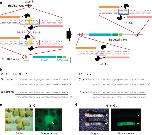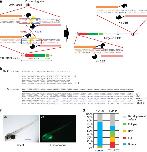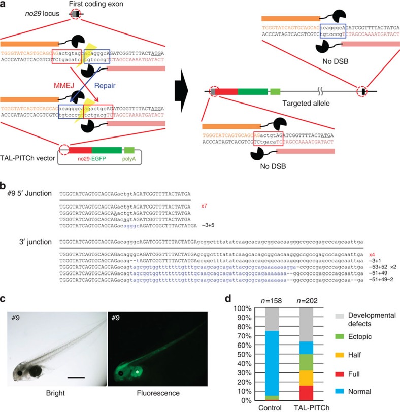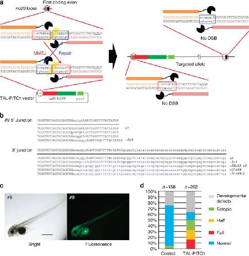 Figure 3. TAL-PITCh at the no29 locus in frog embryos.(a) Schematic illustration of TAL-PITCh at the X. laevis no29 locus. Orange and pink letters indicate the left and right TALEN target sites, respectively. Red and blue boxes indicate the microhomologous sequences. The start codons are underlined. (b) Sequences of knocked-in alleles from embryo #9. The intended knocked-in sequence is shown at the top. TALEN target sites are shown in capital letters. Red letters indicate correctly knocked-in alleles. Blue letters indicate insertions. Dashes indicate deletions. Substitutions are underlined. (c) Bright-field and fluorescence microscopy images of embryo #9. An asterisk indicates yolk autofluorescence. Scale bar, 1 mm. (d) Percentage of phenotypes in the control embryos and the TAL-PITChed embryos. For the control, the vector from which the TALEN target site was removed was used instead of the TAL-PITCh vector. Except for abnormally developed embryos, phenotypes were divided into four groups (full, half, ectopic and normal) according to the expressed region of EGFP. Total numbers of individuals are shown at the top of each graph.