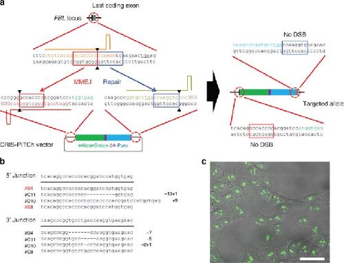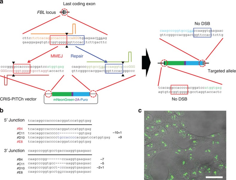 Figure 5. CRIS-PITCh in human cells.(a) Schematic illustration of CRISPR/Cas9-mediated targeted integration using CRIS-PITCh. Orange, pink and green letters indicate the gRNA target sites. Red and blue boxes indicate the microhomologous sequences. The stop codons are underlined. (b) Sequences of knocked-in clones. The intended knocked-in sequence is shown at the top. Dashes indicate deletions. Blue letters indicate the insertion. The substitution is underlined. (c) Confocal laser scanning microscopy image of knocked-in cells showing nucleolar localization of mNeonGreen fluorescence (clone #B4). Scale bar, 30 μm.