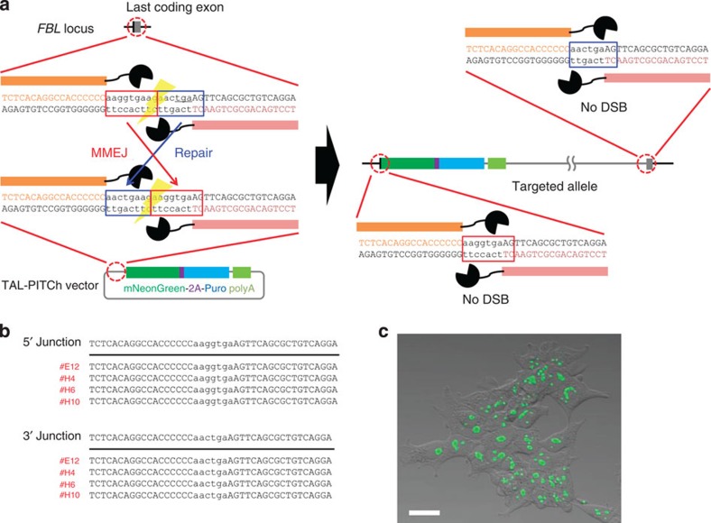Figure 1. TAL-PITCh in human cells.(a) Schematic illustration of TAL-PITCh at the human FBL locus. Orange and pink letters indicate the left and right TALEN target sites, respectively. Red and blue boxes indicate the microhomologous sequences. The stop codon is underlined. (b) Sequences of knocked-in clones. The intended knocked-in sequence is shown at the top. TALEN target sites are shown in capital letters. Red letters indicate correctly knocked-in clones. (c) Confocal laser scanning microscopy image of knocked-in cells showing nucleolar localization of mNeonGreen fluorescence (clone #H6). Scale bar, 30 μm.