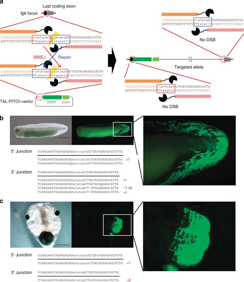 Figure 4. TAL-PITCh at the fgk locus in frog embryos.(a) Schematic illustration of TAL-PITCh at the X. laevis fgk locus. Orange and pink letters indicate the left and right TALEN target sites, respectively. Red and blue boxes indicate the microhomologous sequences. The stop codon is underlined. (b,c) Microscopic images and sequences of the TAL-PITChed embryos showing EGFP expression in the fin (b) and the gill (c). TALEN target sites are shown in capital letters. Red letters indicate correctly knocked-in alleles. Substitutions are underlined. Scale bars, 1 mm.