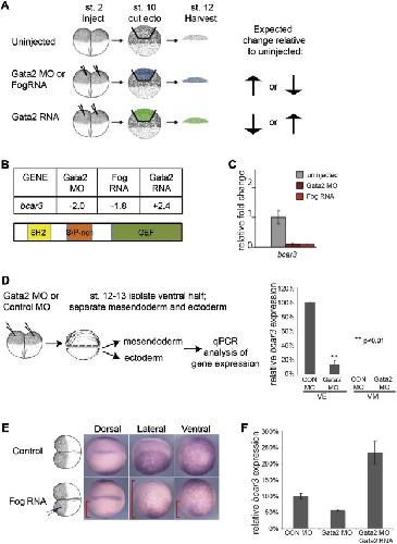 Identification of bcar3 as a target of Gata2 in ectoderm during gastrulation. (A) Schematic of strategy for microarray analysis and target gene identification. Gata2 MO (40 ng), Fog RNA (500 pg) or Gata2 RNA (500 pg) was injected into both cells of two-cell embryos and ectoderm was explanted when embryos reached stage 10. When sibling embryos reached stage 12, RNA was isolated from ectoderm for microarray analysis. Genes showing upregulation in Gata2 MO and Fog RNA injected embryos, and downregulation in Gata2 RNA injected embryos were identified as putative negative targets of Gata2. Genes showing downregulation in Gata2 MO and Fog RNA injected embryos, and upregulation in Gata2 RNA injected embryos were identified as putative positive targets of Gata2. (B) Table showing fold change in bcar3 expression relative to uninjected controls detected by microarray analysis and schematic diagram of Bcar3 structure, SH2: Src homology 2 domain, S/P-rich: Serine/Proline-rich domain, GEF: Guanine nucleotide exchange factor like domain. (C) qPCR analysis of bcar3 gene expression in ectodermal explants isolated at stage 10 from embryos that had been injected with Gata2 MO or Fog RNA and cultured to stage 12. The level of expression of bcar3 was normalized to that in ectoderm from uninjected controls. (D) Gata2 MO (40 ng) or control MO (40 ng) were injected into both cells of two-cell embryos and ventral ectoderm and ventral mesendoderm were dissected at stage 12â13. RNA was extracted from tissue from 10 pooled explants in three independent experiments and bcar3 gene expression was analyzed by qPCR. The level of expression of bcar3 was normalized to that in ectoderm from control MO injected embryos. VE: ventral ectoderm, VM: ventral mesendoderm, ND: not detected. (E) Fog RNA (500 pg) was injected into one cell of two-cell embryos and expression of bcar3 was examined at stage 15 using WMISH. Uninjected embryos were used as controls. In each row, dorsal, lateral and ventral views of the same embryo are shown. Brackets indicate the Fog RNA injected side. (F) Gata2 MO (40 ng), control MO (40 ng), or Gata2 MO (40 ng) and Gata2 RNA (1 ng) together was injected into both cells of two-cell embryos and ectoderm was explanted when embryos reached stage 10. When sibling embryos reached stage 12, RNA was isolated from ectoderm for qPCR analysis. The level of expression of bcar3 was normalized to that in ectoderm from control MO injected embryos. |