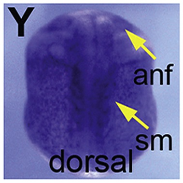 bcar3 (breast cancer anti-estrogen resistance 3) gene expression in Xenopus laevis embryo, assayed via in situ hybridization, NF stage 18, dorsal view, anterior up. |