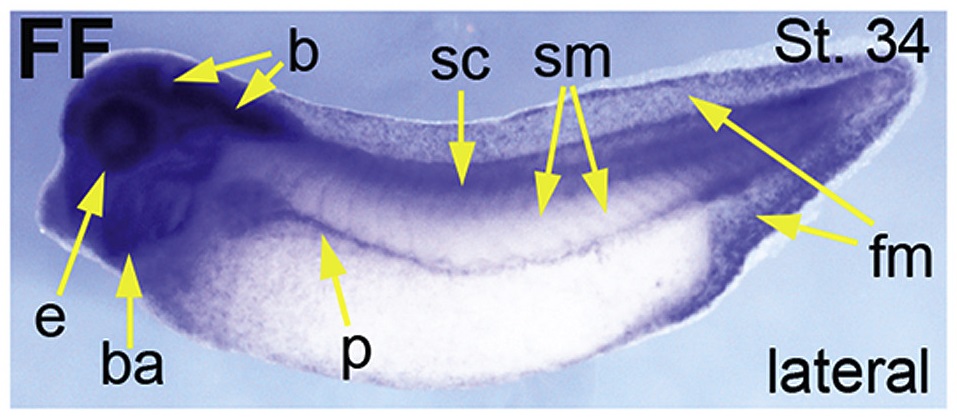 bcar3 (breast cancer anti-estrogen resistance 3) gene expression in Xenopus laevis embryo, assayed via in situ hybridization, NF stage 34, lateral view, anterior left, dorsal up. |