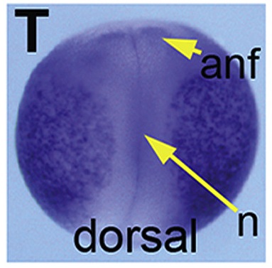bcar3 (breast cancer anti-estrogen resistance 3) gene expression in Xenopus laevis embryo, assayed via in situ hybridization, NF stage 9, lateral view, animal up. |