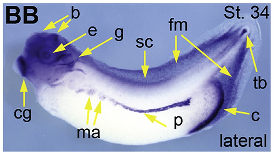 bcar1 (breast cancer anti-estrogen resistance 1) gene expression in Xenopus laevis embryo, assayed via in situ hybridization, NF stage 34, lateral view, anterior left, dorsal up. |