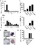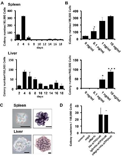 Figure 2. Biological activity of recombinant X. laevis TPO. (A) Colony-formation of spleen and liver cells in response to xlTPO. Upper panel shows the time course of colony formation by spleen cells; lower panel represents liver cells. (B) Dose-response effect of recombinant xlTPO on blast colony formation by splenic and hepatic cells. The upper panel shows spleen cell colony formation; the lower panel represents liver cells. Graphs represent means + SD, n = 3. *P < 0.05 vs. 0 ng/mL; **P < 0.05 vs. 0.1 ng/mL; ***P < 0.05 vs. 1.0 ng/mL. (C) Colony morphology. Left panels show colonies derived from X. laevis spleen and liver cells after 4 days culture in semisolid medium in the presence of xlTPO. Scale bars represent 20 μ m. Right panels show the morphology of T12-stained colonies. (D) Hepatic cells were incubated with xlMpl-Fc fusion protein or normal mouse IgG2a as a control in the presence of xlTPO, and cultured in semi-solid media. After 4 days, xlMpl-Fc fusion protein inhibited colony formation; colonies formed in the presence of xlTPO alone or both xlTPO and IgG2a. Graphs represent means + SD, n = 3. *P < 0.05 vs. xlTPO or IgG2a + xlTPO stimulation. |