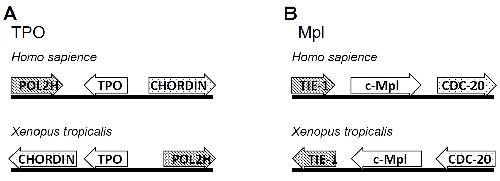 Supplementary Figure 2. Conserved syntenyand homology between the X. tropicalisand human TPO and Mplloci. (A) RNA polymerase II H (POL2H) and Chordin, mapped in the hTPOlocus, were identified by NCBI Homologeneor BLAST search in the X.tropicalisgenome database. The syntenyof POL2H, CHORDIN, and TPO at the human, mouse, chicken, and X. tropicalisTPO loci was conserved, although their order and direction of transcription has been shuffled (B) TIE-1 and CDC-20 in xlMplwere identified by NCBI Homologeneor BLAST in the X. tropicalisgenome database. The syntenyof TIE-1, CDC-20, and Mplat the human, mouse, chicken, and X. tropicalisMplloci was also conserved, although their order and direction of transcription has been shuffled. |