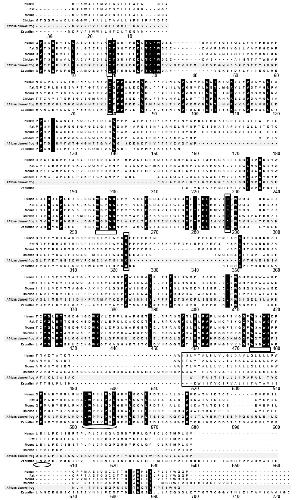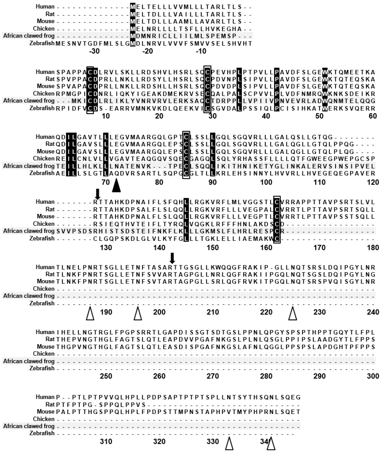 Supplementary Figure 3. Homology of TPOsfrom various vertebrate species. Amino acid sequence homology of mature TPOs from human, rat, mouse, chicken, X. laevis, and zebrafish. Numbers represent positions from the N-terminal end of mature xlTPO. The predicted signal peptide is shown at the top and indicated in lowercase letters. Identical amino acid residues are shaded black. Cysteine residues that form possible disulfide bridges in xlTPO are boxed. Positions of potentialN-linked carbohydrate on xlTPO and hTPOare indicated by solid and open arrowheads, respectively. Potential sites for N-glycosylation are conserved in human, rat, and murine TPOs, whereas zebrafish, chicken, and X. laevisTPOs lack a C-terminal domain. The thrombin cleavage site in hTPOis indicated by an arrow. The tertiary structure of human TPO has been solved as an antiparallel four-helix bundle fold. TPO sequences were obtained from GenBank(accession numbers: human, AAI30323; rat, BAA06906; mouse, AAA40436; chicken, AAT45554; zebrafish, NP_001137225). |