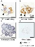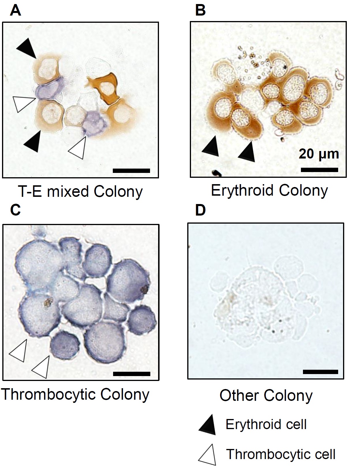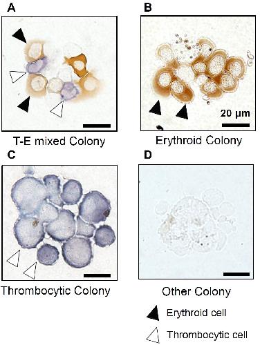 Supplementary Figure 6. Colonies derived from hepatic cells in the presence of anemic serum. Hepatic cells from anemic frogs were cultured in semi-solid medium in the presence of anemic serum. After four days, the cell were collected and cytocentrifugedsmears were prepared using a cytospincytocentrifuge. Colonies were immunostainedfor T12 and counterstained with o-dianisidine. (A) Colony of T12-and o-dianisidinepositive cells. (B and C) Colony composed of only o-dianisidineor T12-positive cells. (D) Colony composed of non-hemoglobinizedcells. |