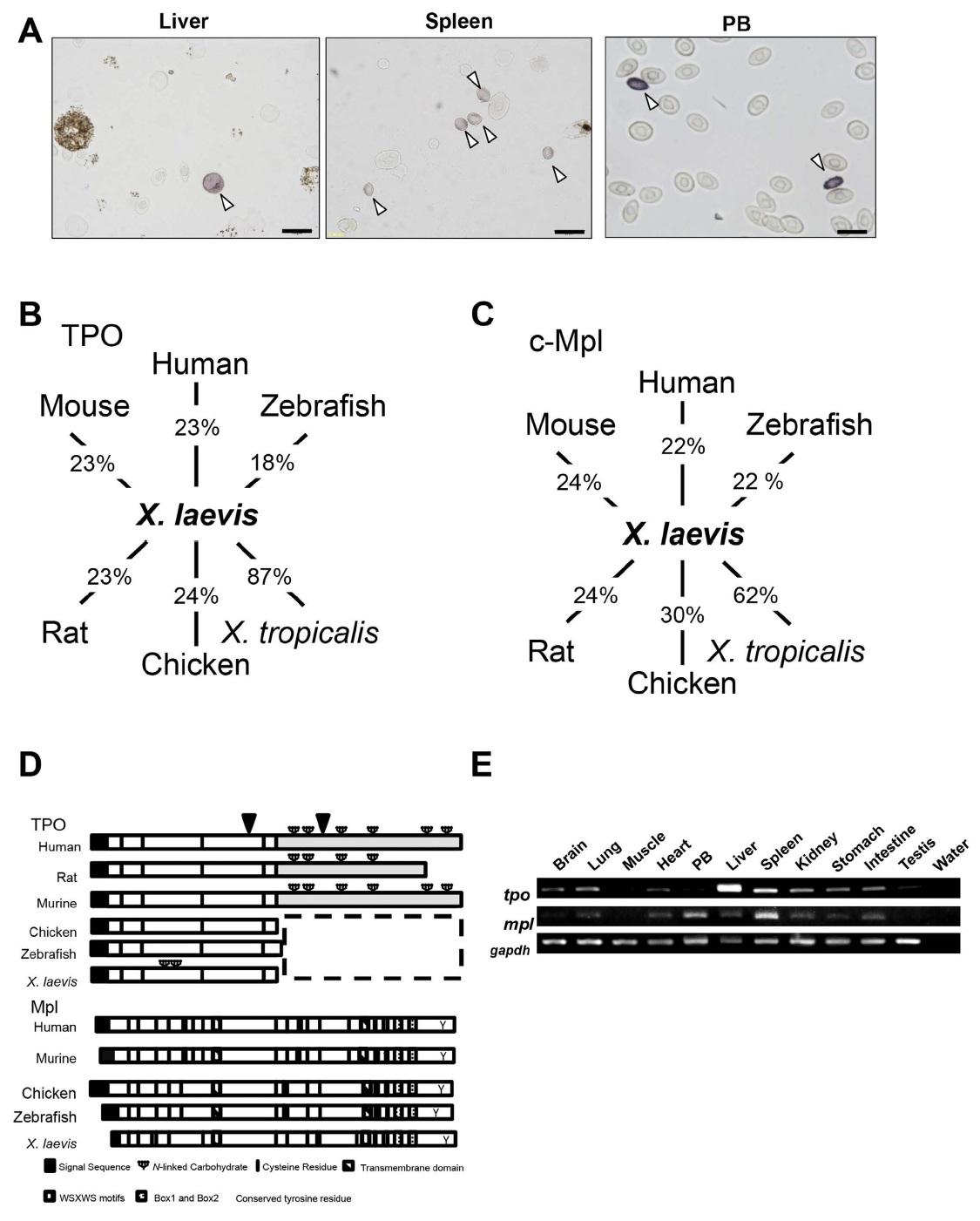 Figure 1. Conserved synteny homology between the Xenopus tropicalis and human TPO and Mpl loci and RNA expression of TPO and Mpl in X. laevis tissues. (A) Dissociated cells obtained from the X. laevis spleen, liver, and peripheral blood were immunostained for T12. Arrowheads indicate T12-positive cells. Scale bars represent 20 μ m. (B) TPO similarity of the domain from the first to the fourth Cys residues in X. laevis and in human (23%), mouse (23%), rat (23%), chicken (24%), X. tropicalis (87%), and zebrafish (18%). (C) The extracellular region of xlMpl shares homology with human (22%), mouse (24%), rat (24%), chicken (30%), zebrafish (22%), and X. tropicalis (62%). (D) Schematic diagram of human, rat, mouse, chicken, X. laevis, and zebrafish TPO and Mpl. Black boxes indicate signal sequences. Open box indicates the conserved erythropoietin (Epo)/Tpo domain. Black bars indicate the conserved cysteine residue. Grey box indicates the c-terminal TPO domain and putative cleavage sites are indicated by solid arrowheads. In Mpl, the vertical striped box shows haematopoietin domains with conserved WSXWS motifs; the dotted box shows Box1 and Box2, the shaded portion represents the transmembrane domain, and Y represents the conserved tyrosine residue. (E) RT-PCR analysis of tpo and mpl mRNA of X. laevis in selected organs. Uncropped gel images are shown in Supplementary Fig. S9. |