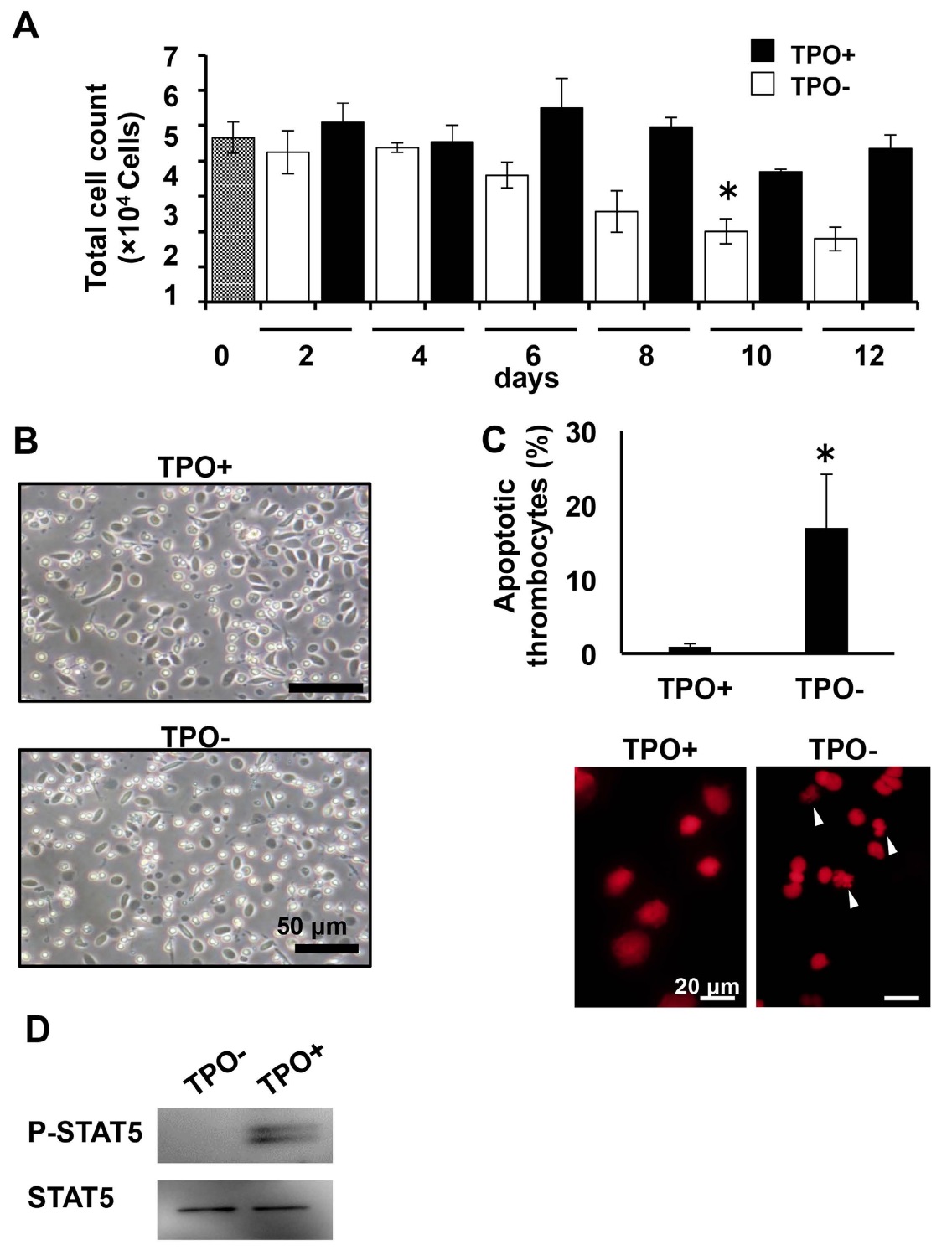 Figure 6. Functions of xlTPO–xlMpl signalling in peripheral thrombocytes. (A) Peripheral thrombocytes were collected by density-gradient centrifugation and cultured in dα -MEM with xlTPO. Thrombocyte viability was assessed by trypan blue staining. Thrombocyte numbers are indicated after stimulation with 10 ng/mL xlTPO (black bars) and without stimulation (white bars). Graphs represent means ± SD, n = 3. *P < 0.05 vs. day 0. (B) Thrombocyte morphology in suspension in the presence (upper panel) or absence (lower panel) of xlTPO for 8 days of culture. (C) Representative image of apoptotic cells detected by Propidium iodide nuclear staining. Apoptotic cells were counted after 8 days of culture. Apoptotic nuclei are marked with arrows (Bar, 20 μ m). Graphs represent means + SD, n = 3. *P < 0.05 vs. TPO+ . (D) STAT5 phosphorylation in thrombocytes. Western blots of P-STAT5 and STAT5 in the presence or absence of xlTPO. Uncropped gel images are shown in Supplementary Fig. S9. |