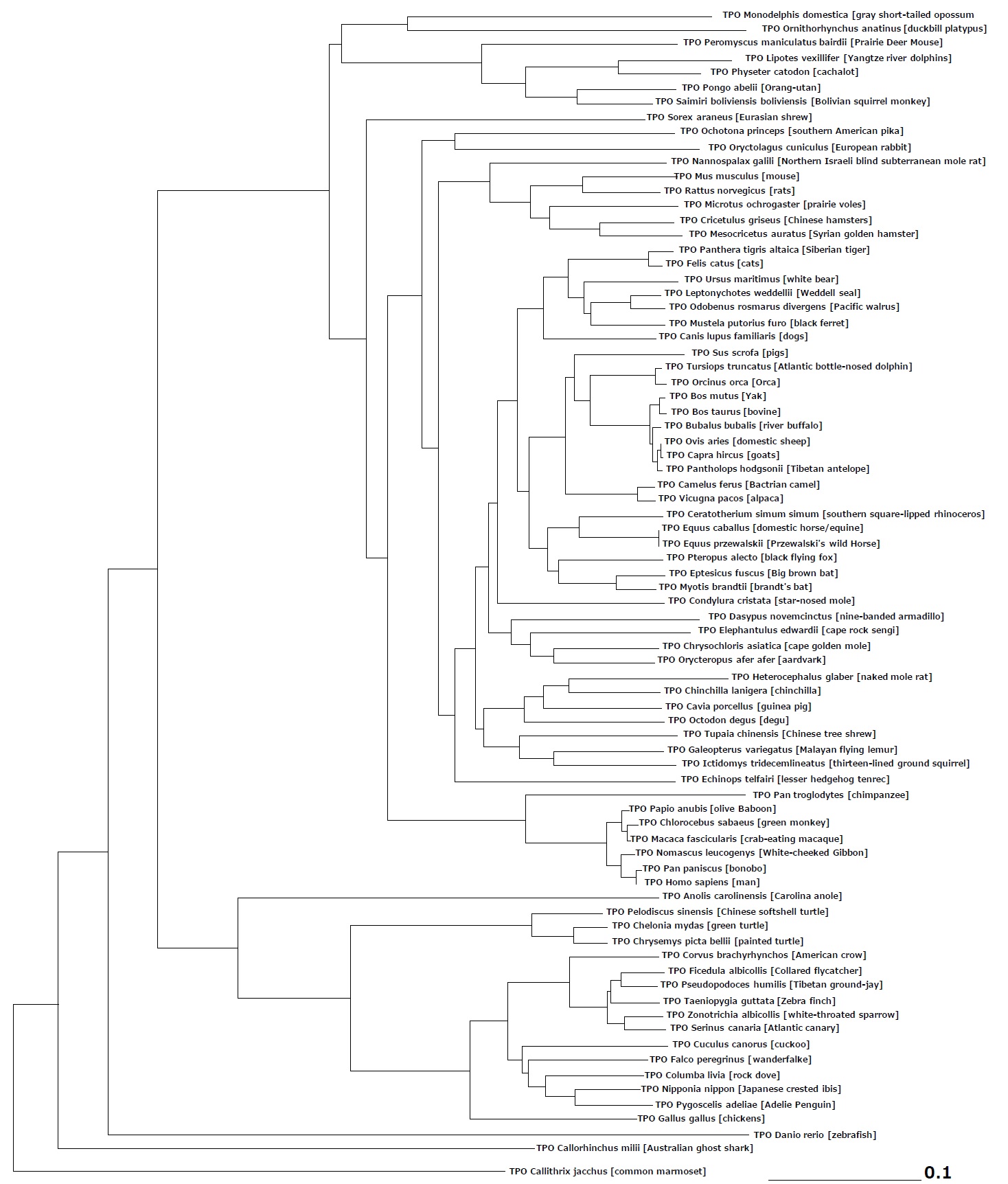 Supplementary Figure 1. Phylogeny of putative thrombopoietin. Phylogenyanalyses were performed by use of ClustalOmega and ClustalPhylogeny for proteins, provide throughthe analysis tool web services from the EMBL-EBI (http://www.ebi.ac.uk/Tools/msa/clustalo/). The deduced sequences of TPO were aligned with the program ClustalOmega and a tree was calculated using TreeViewXsoftware1-3. 1.Sievers, F. et al.Fast, scalable generation of high-quality protein multiple sequence alignments using ClustalOmega. Molecular Systems Biology7,(2011). 2.Goujon, M. et al.A new bioinformatics analysis tools framework at EMBL-EBI. Nucleic Acids Res.38,(2010). 3.McWilliam, H. et al.Analysis Tool Web Services from the EMBL-EBI. Nucleic Acids Res.41,(2013). |