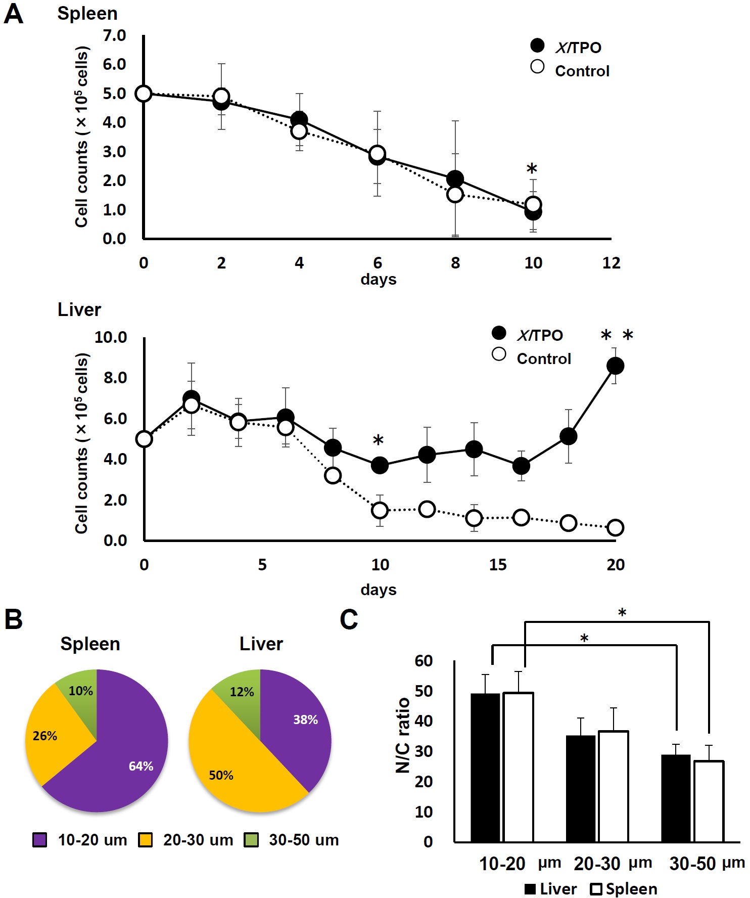 SupplementaryFigure7.ViabilityofsplenicorhepaticcellsafterxlTPOstimulation.(A)WholecellswerecountedduringliquidcultureofspleenorlivercellsinthepresenceofxlTPO.Opensquaresrepresentthecontrol.BlacksquaresrepresentxlTPO-stimulatedcells.*P<0.05vs.day0;**P<0.05vs.day10.Thedatarepresentmean ± SD(N = 3).(B)CellulardistributionwasinvestigatedoncytospinpreparationsfromhepaticandspleniccellsafterculturingwithxlTPOfor8days.(C)Morphologicalfeaturesofhepaticandspleniccellsat8daysofculturesuchasN/Cratiowascalculatedusingimagesofcellsbyimage-Jsoftware.BlackbarsindicateshepaticxlTPO-stimulatedcells.WhitebarsindicatessplenicxlTPO-stimulatedcells.Analysiswasperformedthreetimes(N=3).ResultsarepresentedasmeanSD.*P<0.05 |